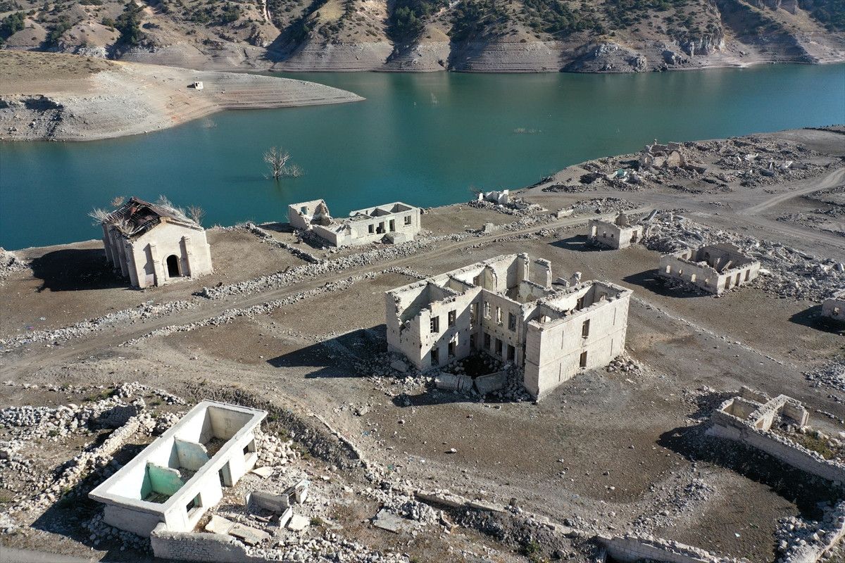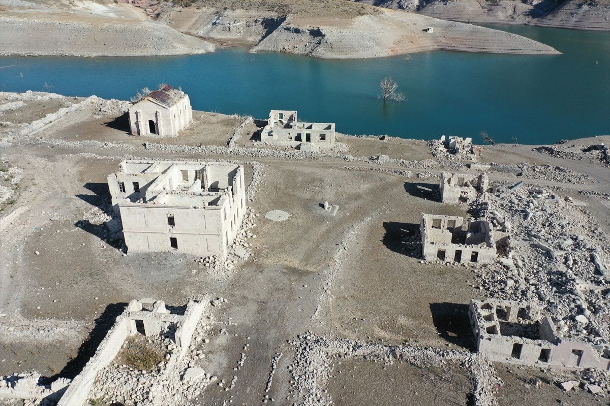 Baraj kapaklarının kısmen açılmasıyla su seviyesi düşünce köydeki evler, cami, kilise ve bazı tarihi binalar gün yüzüne çıktı.
