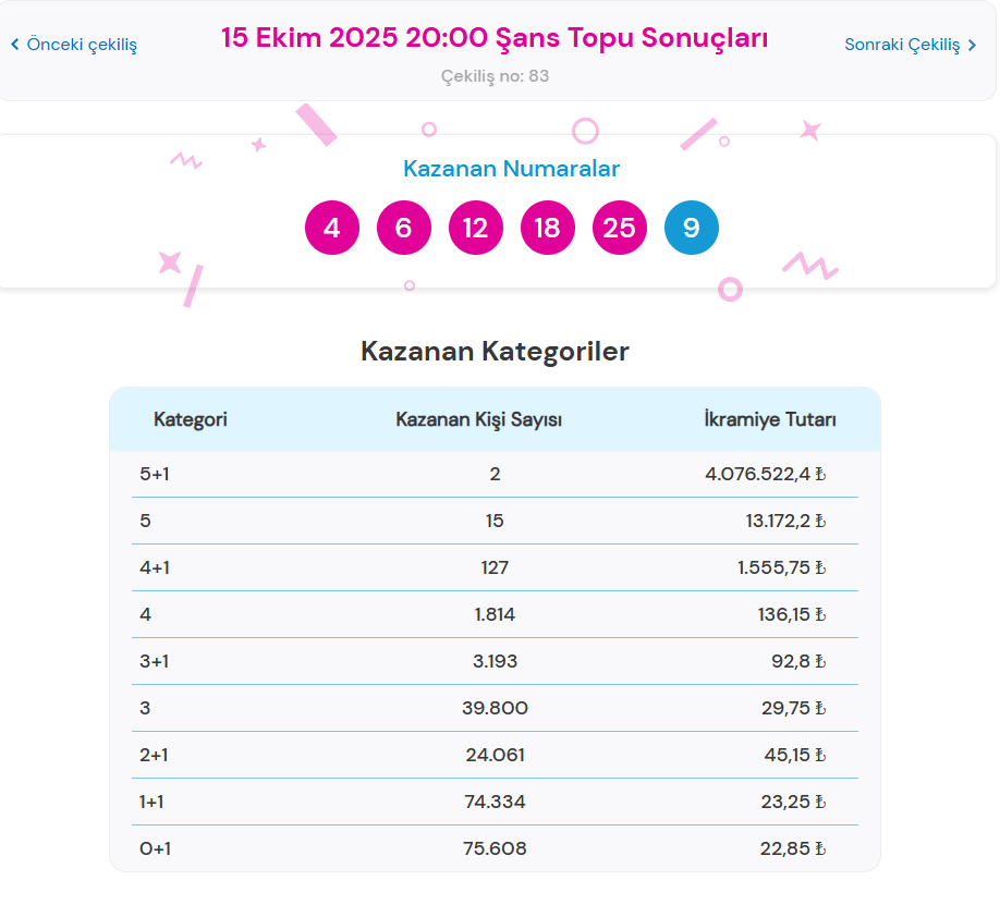 15 Ekim 2025 günü gerçekleşen canlı çekiliş sonrası sonuçlar belli oldu. Çekilişte 5+1 bilen 2 talihli tam 4.076.522,4 TL ikramiye kazandı.